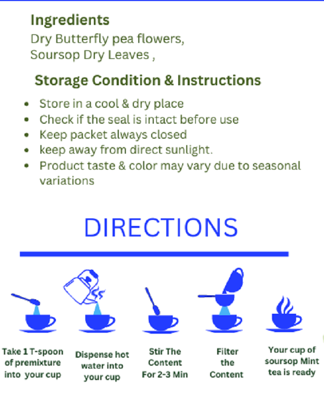 Soursop Blue Tea Premix is made by soursop leaves & Dry Butterfly Pea Flowers. Soursop Blue Tea Premix is generally use for making healthy tea of soursop. Soursop tea is categorized as a healthy warming drink for a good start. Soursop Blue tea Premix  is completely natural and definitely has no side effects. Helps to protect  your immune system and avoid deadly infections. It keeps you fresh and strong.